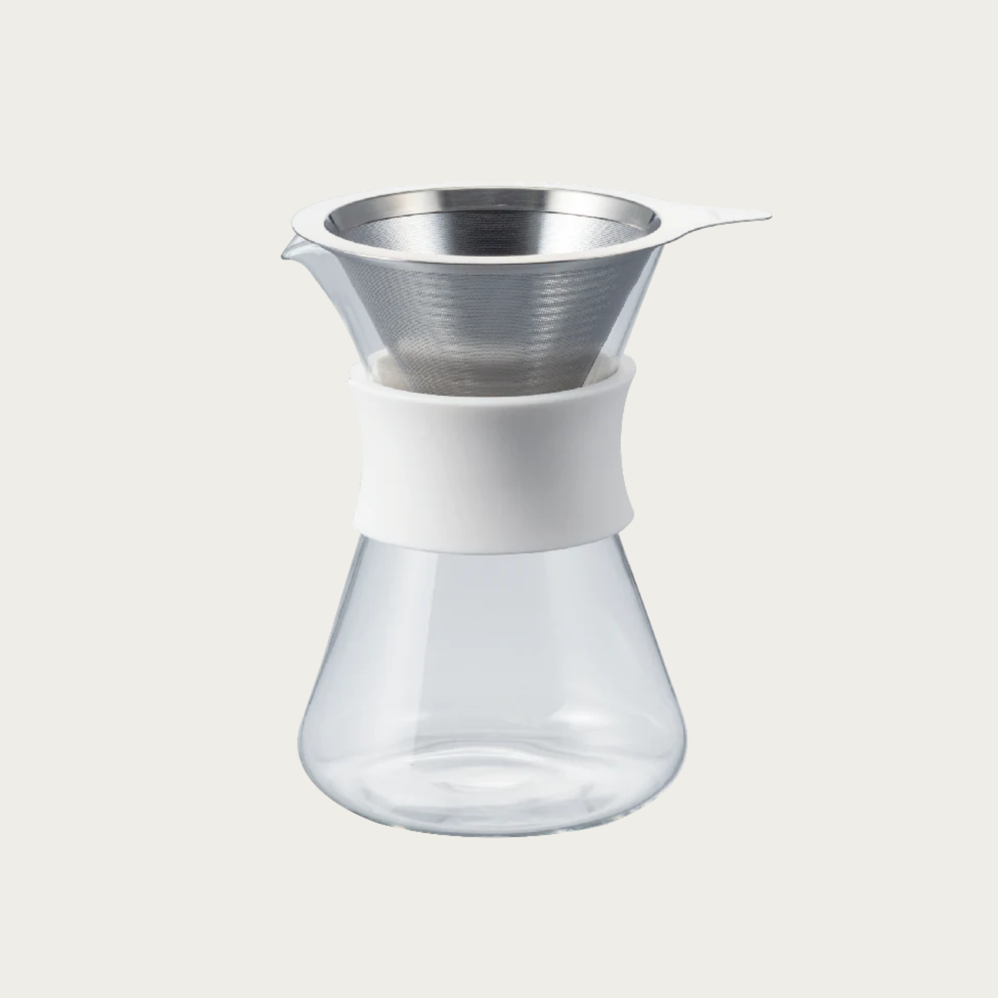Featuring a dripper with a premium stainless steel double mesh filter and a sleek decanter-style server. The double-layered mesh filter boasts intricately etched details, allowing you to enjoy coffee with the perfect blend of the clean taste of a paper filter and the rich oils of a metal filter.