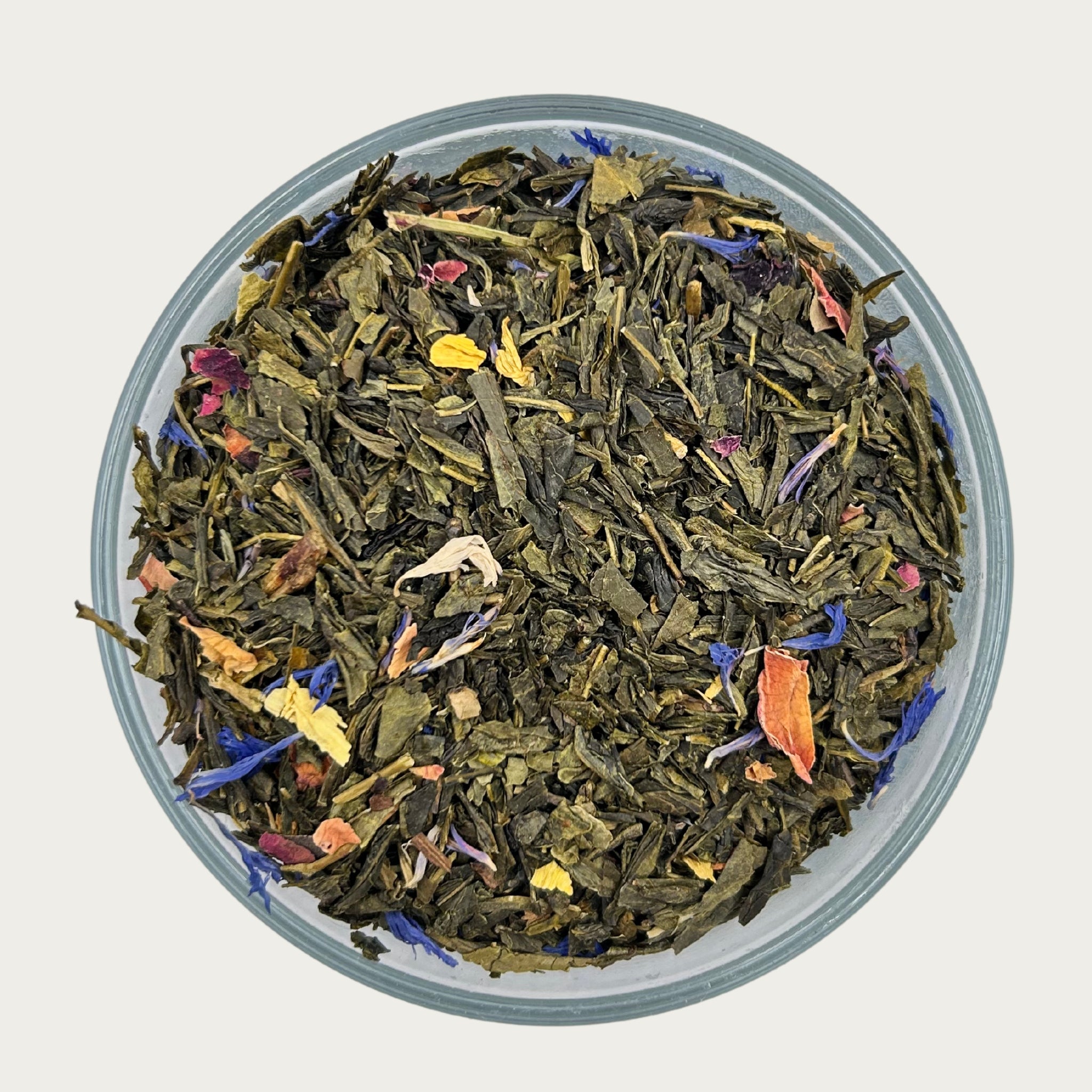 Green tea, flavoring, sunflower petals, rose petals, cornflower petals