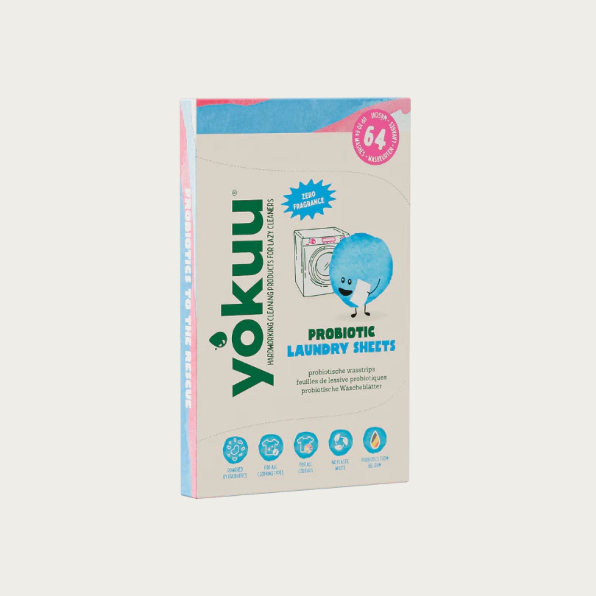 Each recyclable pack contains 32 probiotic laundry sheets (up to 64 washes!).