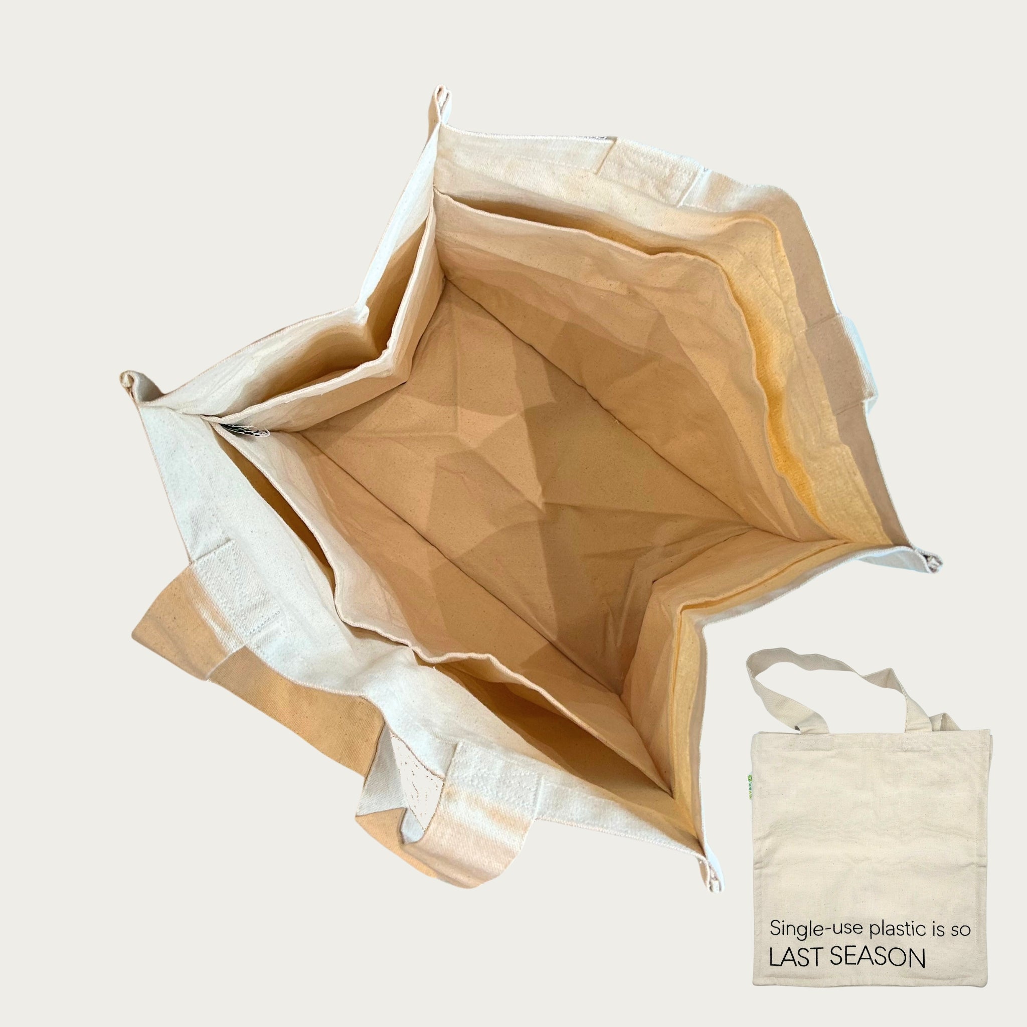 Reusable and washable GOTS Certified Organic Cotton tote with 6 interior pockets perfect for package-free shopping. Large and sturdy, the Pocket Tote can fit all your glass jars and bottles, keeping them effortlessly safe and separated during transportation.